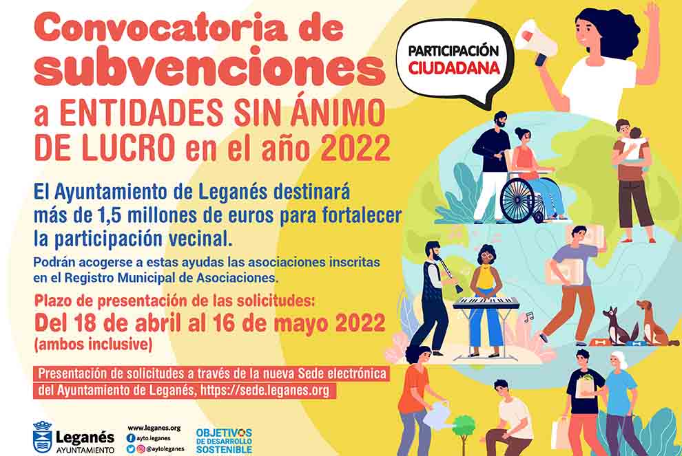 El Ayuntamiento de Leganés ha informado que la concejalía de Participación Ciudadana ha puesto en marcha la convocatoria de subvenciones a asociaciones y entidades sin ánimo de lucro para el año 2022 con un monto de 1.531.520 euros. El plazo de presentación de solicitudes y proyectos estará abierto desde el 18 de abril al 16 de mayo.