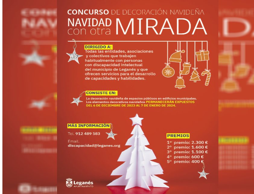 El Ayuntamiento de Leganés ha informado de que el plazo para inscribirse al concurso de decoración “Navidad con otra mirada” estará abierto hasta este jueves 16 de noviembre. La convocatoria va dirigida a aquellas entidades y asociaciones que trabajan habitualmente con personas con discapacidad intelectual y habrá diplomas y premios en metálico para los ganadores por un importe total de 6.000 euros.