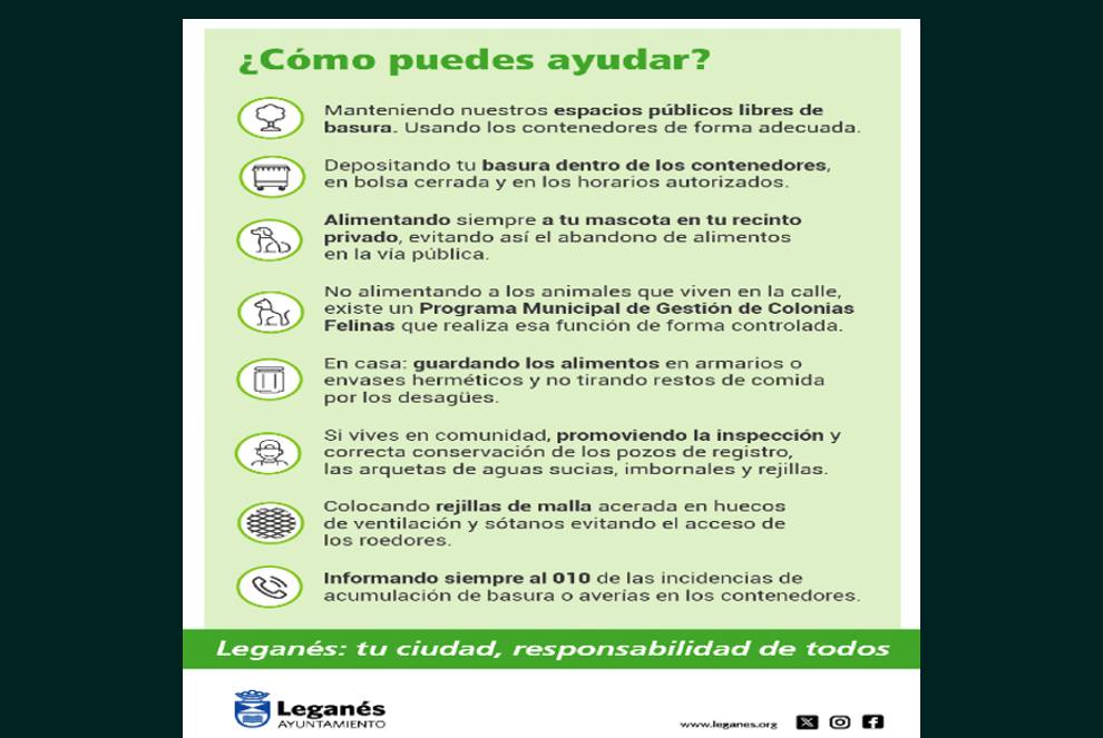 El Ayuntamiento de Leganés, a través de la Concejalía de Medio Ambiente, está desarrollando una campaña de concienciación para el control de roedores. El Consistorio ha detectado algunas zonas en las que la incorrecta gestión de residuos ha podido favorecer la presencia de roedores. Por ello, pide la colaboración vecinal a la hora de no depositar bolsas de basura abiertas o fuera de horario, y que no se tiren restos de comidas en los inodoros.