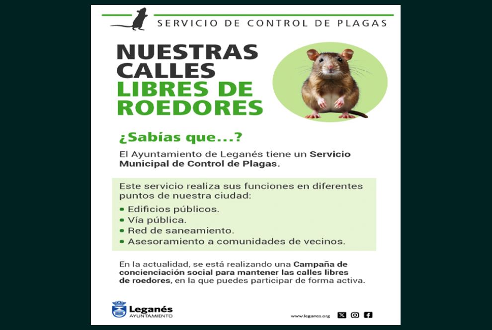 Desde el servicio de control de plagas del Ayuntamiento de Leganés se realizan desratizaciones periódicas en 3.000 puntos de la red de alcantarillado, así como en arquetas de otras instalaciones de la vía pública. Estas revisiones se realizan cada 45 días con la finalidad de minimizar la población de roedores, colocando cebos y comprobando rastros como excrementos u orificios.