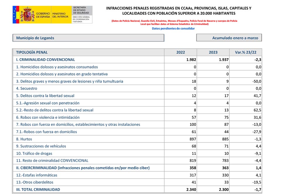 El gobierno de España ha hecho público el balance de criminalidad del primer trimestre de 2023 una vez superados los procesos electorales: Municipales, autonómicas y Generales. El dato de Leganés es sensiblemente inferior al mismo dato del año pasado. Se ha rebajado el número de infracciones penales en un 1,7% pasando de 2.340 a 2.300 en el mismo periodo de referencia de datos de 2022 a 2023.