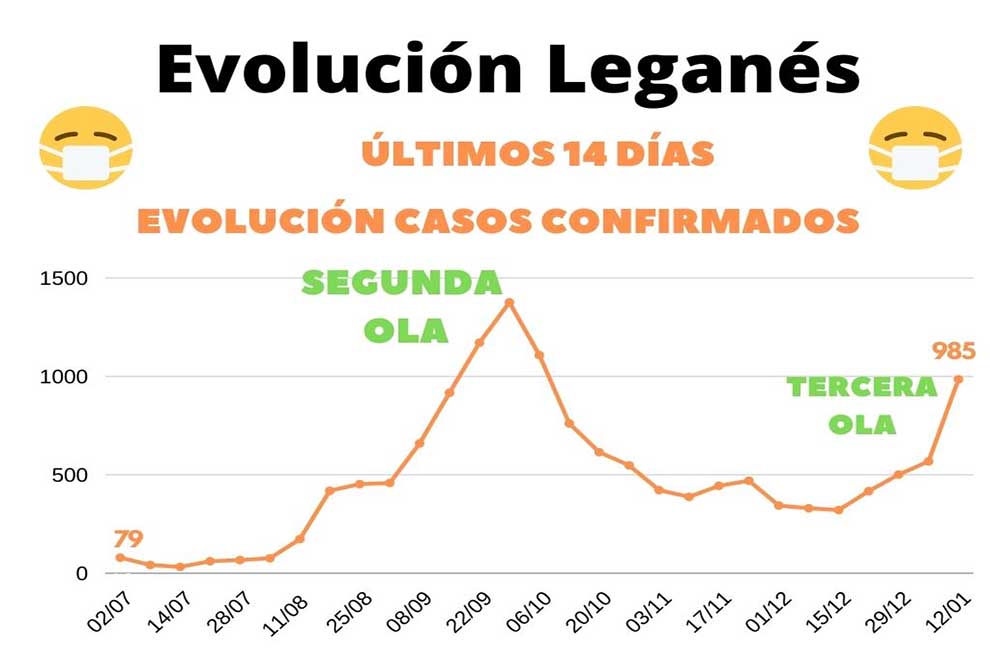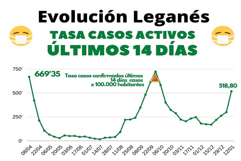 Tal y como se esperaban, los datos de la tasa de contagio del COVID en Leganés se ha disparado en la última semana alcanzado en Leganés los 518,80 casos por cada 100 mil habitantes. Una cifra muy alta que evidencia que la ciudad está camino de alcanzar en las próximas semanas el pico de esta tercera ola de contagios.