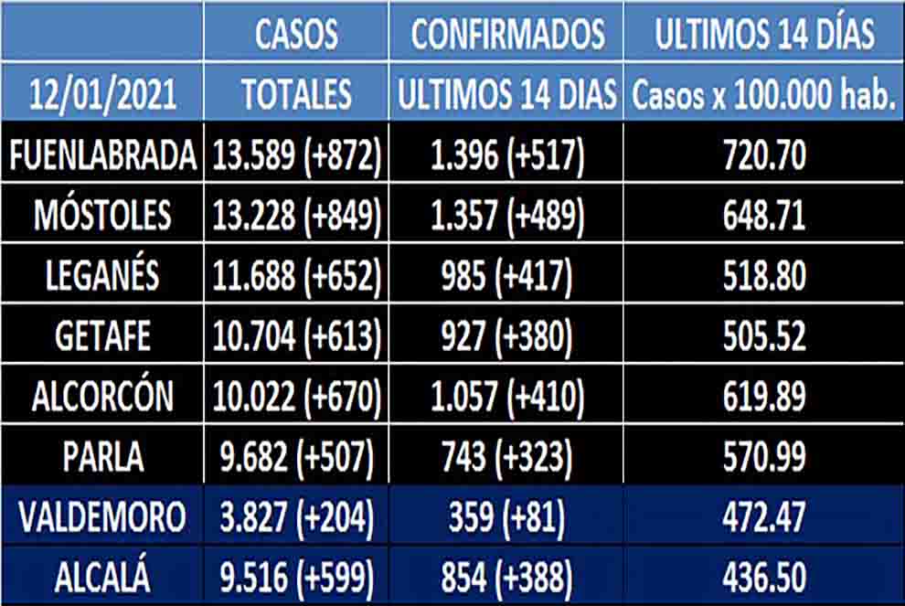 Fuenlabrada y Móstoles vuelven a disparar los casos, los casos confirmados y la tasa. Así, la localidad vecina se ha ido hasta los 720,70 casos por cada 100 mil habitantes, y Móstoles a 648,71. El incremento de casos confirmados en la primera, en los últimos 14 días, ha sido de 517 mientras que en Móstoles ha sido de 489.