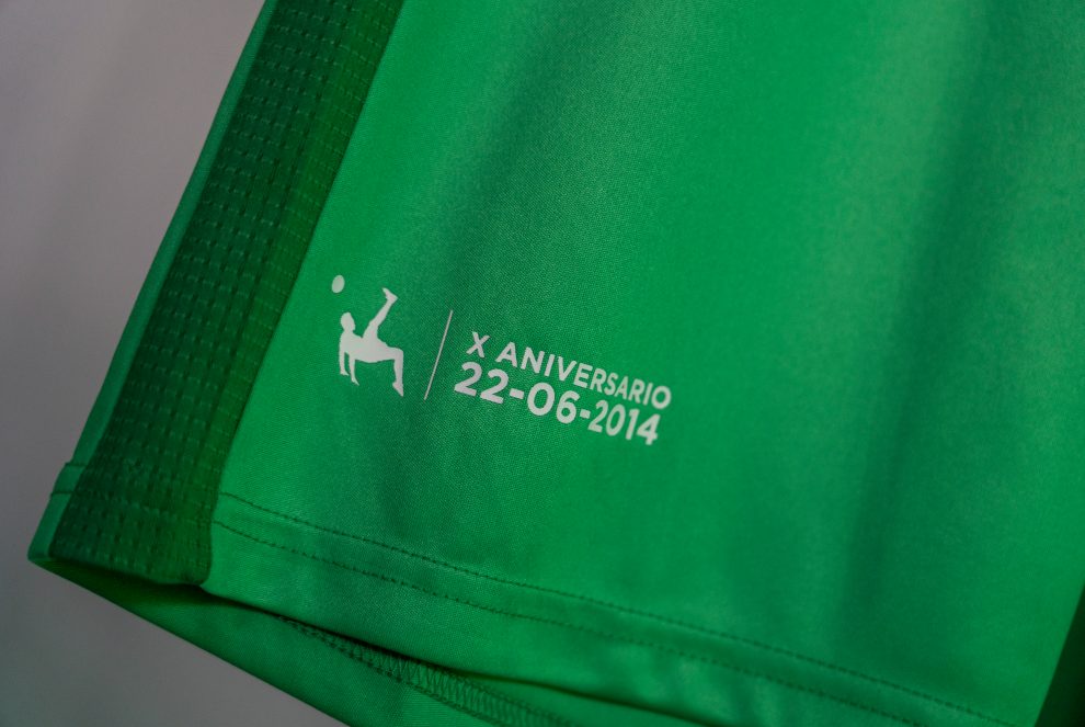 La elástica cuenta con el escudo bordado y también con la imagen de la chilena y la inscripción “X Aniversario, 22-06-2014” en color blanco en la parte inferior derecha del frontal, y presenta también tonos verdes más oscuros con detalles en el cuello redondo y las mangas con ajuste en rib y en el lateral de la camiseta. Para presentarla, el club llevó de nuevo a Carlos Álvarez al estadio La Feixa Llarga de L’Hospitalet de Llobregat diez años después del día en que se produjo la chilena del ascenso. El asturiano volvió por primera vez al escenario de su momento más feliz como futbolista gracias también a la colaboración y predisposición del C.E. L’Hospitalet.
