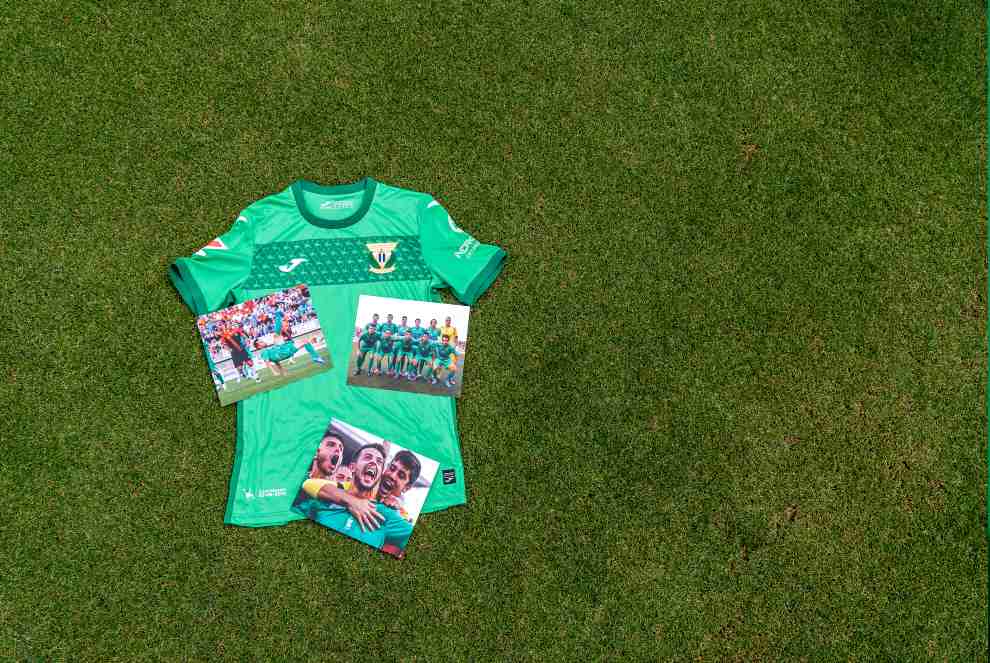 La camiseta presenta un diseño prácticamente idéntico a la de aquella temporada 2013/14, con un color verde pepinero con el que el club consiguió volver al fútbol profesional tras una década en Segunda División ‘B’. Y lo hizo tras un playoff que culminó con la visita a La Feixa Llarga y una chilena que cambió la historia del Leganés. Precisamente la imagen de ese icónico remate del delantero asturiano Carlos Álvarez ocupa la franja de color verde oscuro del pecho.