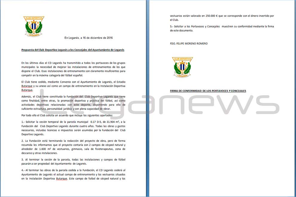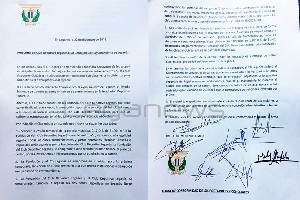 A las 15.51 de esta tarde, LEGANEWS adelantaba a modo de flash en la red social twitter que el acuerdo se acababa de producir. Nuestro periódico había tenido acceso esta semana al primer documento remitido por el Leganés a los políticos de la ciudad que constaba de ocho puntos. Sin embargo quisimos esperar para poder comparar con el documento definitivo. Ambos escritos se los ofrecemos de forma gráfica en esta información.
