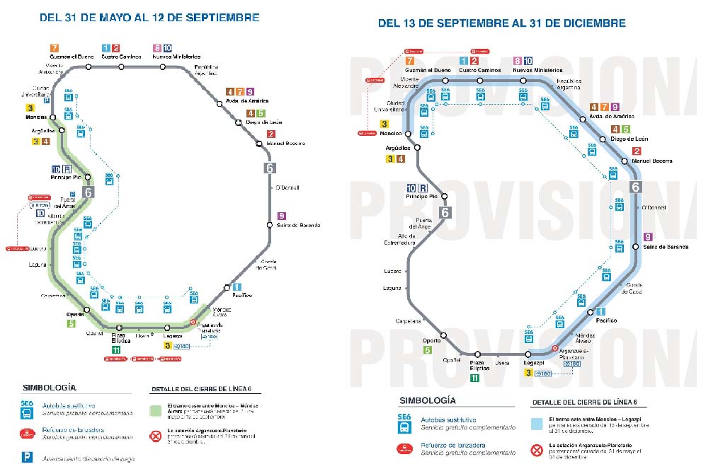 Las primeras actuaciones se realizarán sobre el arco oeste de la L6, entre Moncloa y Méndez Álvaro, provocando la suspensión del servicio en esta área hasta el 12 de septiembre, aunque ambas estaciones estarán disponibles al operar como cabeceras del tramo abierto. En una segunda fase de los trabajos, entre el 13 de ese mes y el 31 de diciembre, se actuará sobre la zona este, entre Moncloa y Legazpi. Por su parte, la estación de Arganzuela-Planetario permanecerá cerrada a los viajeros durante todo el tiempo, ya que ejercerá como centro de coordinación de las labores previstas.