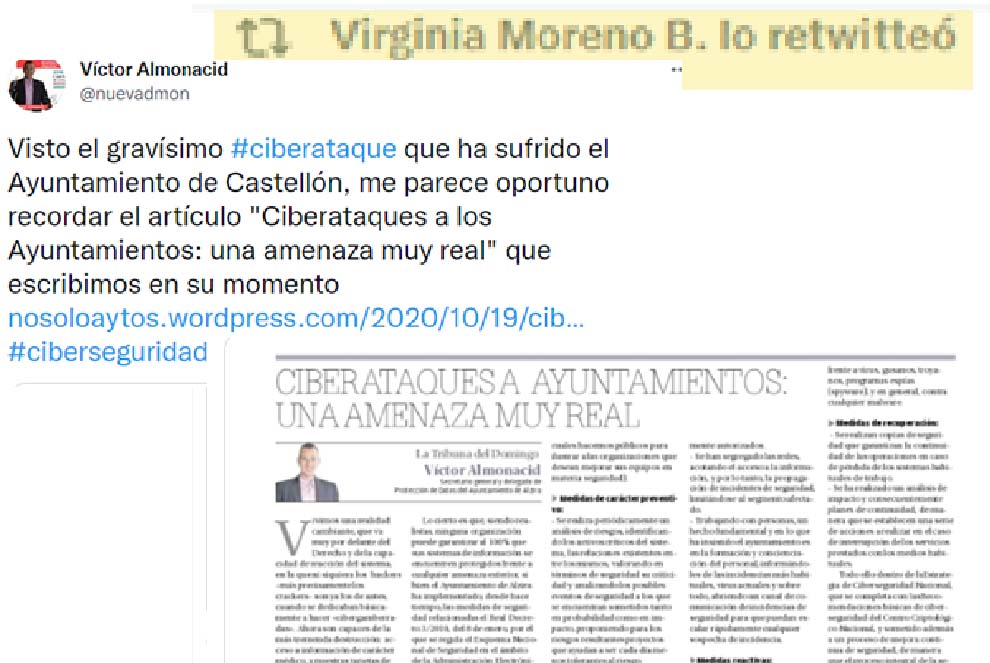 Moreno Bonilla tiene dos ‘incunables’ en sus Redes Sociales. Uno de ellos es su aportación a un libro titulado ‘Ciberseguridad’ (Un nuevo reto para el Estado y los gobiernos locales). Mientras que otro fue un retuit de hace meses de un tuit de Víctor Almonacid, secretario de la Administración Local, en el que indicaba que ‘Visto el gravísimo ciberataque que ha sufrido el Ayuntamiento de Castellón, me parece oportuno recodar el artículo ‘Ciberataques a los Ayuntamientos: una amenaza muy real”.