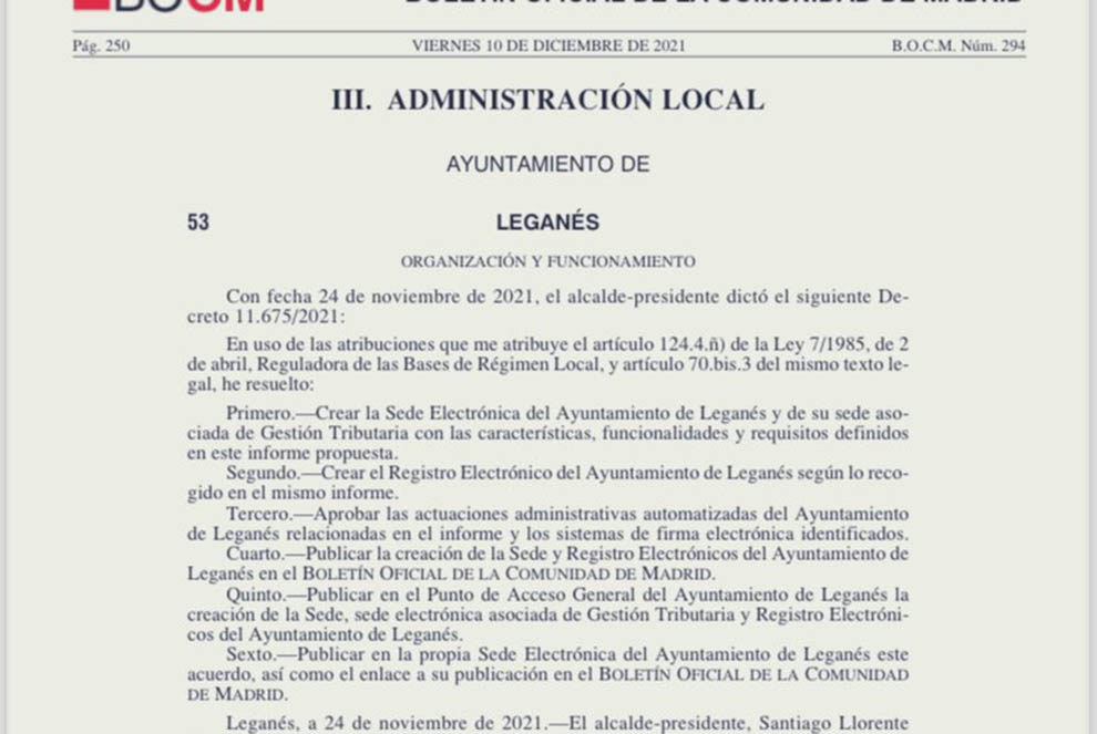 El Boletín Oficial de la Comunidad de Madrid publicaba hoy, en su página 250, una información del Ayuntamiento vinculada al departamento de Informática. Cinco días después del ciberataque veía la luz oficialmente un acuerdo del pasado día 24 de noviembre para la creación de dos importantes herramientas informáticas: la Sede Electrónica del Ayuntamiento y de su sede asociada de Gestión Tributaria, y el Registro Electrónico del Ayuntamiento.
