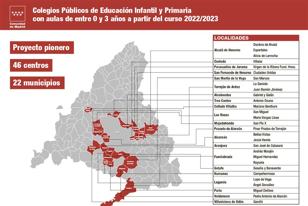 También se aplicará en los CEIP Doctora de Alcalá, Espartales y Alicia Larrocha (Alcalá de Henares); Villalar (Coslada); Virgen de la Ribera Fundación Hermanos (Paracuellos de Jarama); Ciudades Unidas (San Fernando de Henares); San Marcos (San Martín de la Vega); La Gaviota y Juan Ramón Jiménez (Torrejón de Ardoz); Gabriel y Galán (Alcobendas); Antonio Osuna (Tres Cantos); Mariano Benlliure (Collado Villalba); San Miguel y Mario Vargas Llosa (Las Rozas de Madrid); San Pío X (Majadahonda); Pinar Prados de Torrejón (Pozuelo de Alarcón); Bellas Vistas y Jesús Varela (Alcorcón); San José de Calasanz (Aranjuez); Andrés Manjón, Miguel Hernández y Rayuela (Fuenlabrada); Seseña y Benavente (Getafe); Campohermoso (Humanes de Madrid); Lope de Vega y Ángel González (Leganés); Miguel Delibes (Parla); Pedro Antonio de Alarcón (Valdemoro) y Gandhi (Villaviciosa de Odón).