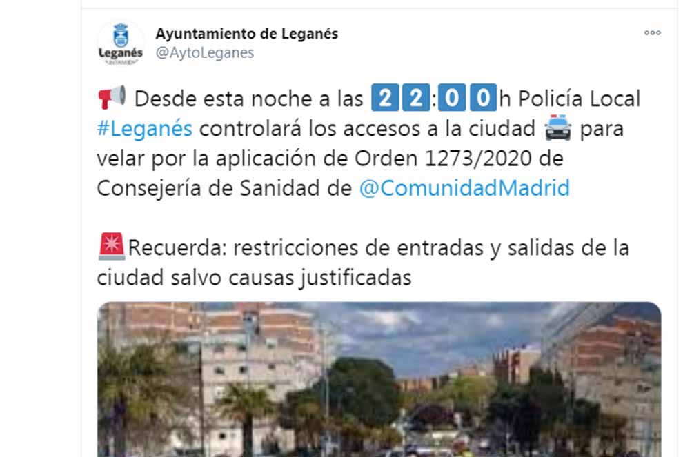 El anuncio realizado desde el Consistorio asegura que “desde esta noche a las 22:00 Policía Local de Leganés controlará los accesos a la ciudad para velar por la aplicación de la Orden 1273/2020 de la Consejería de Sanidad de la Comunidad de Madrid”.