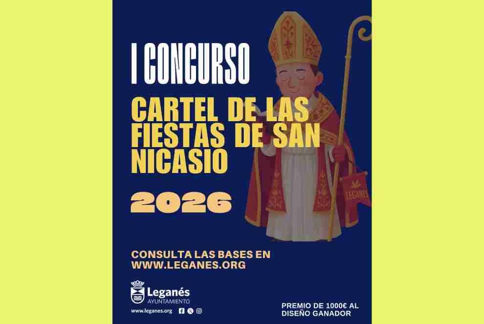 26/03/2026.- El Ayuntamiento de Leganés, a través de la Delegación de Festejos, ha convocado el primer Concurso del Cartel Anunciador de las Fiestas de San Nicasio. Cualquier vecino residente en el municipio, mayor de 16 años, puede presentar su diseño del cartel del 1 de abril al 30 de mayo. Las obras deberán ser originales e inéditas y reflejar el espíritu festivo y la tradición popular en honor al patrón de Leganés y el ganador se llevará un premio de 1.000 euros.