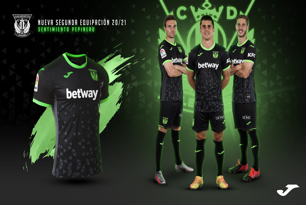 El C.D. Leganés ha presentado esta mañana la que será su segunda nueva equipación para la temporada 2020/2021. Una nueva equipación que destaca por sus detalles en color verde pepinero en cuello, mangas y escudo; sobre un predominante color negro, habitual en equipaciones alternativas del C.D. Leganés en los últimos años. Incluye el lema “Sentimiento Pepinero” en la parte posterior del cuello, y un estampado frontal con triángulos en gris antracita. Además, la camiseta y pantalón viene acompañado por la presencia de distintos patrocinadores.