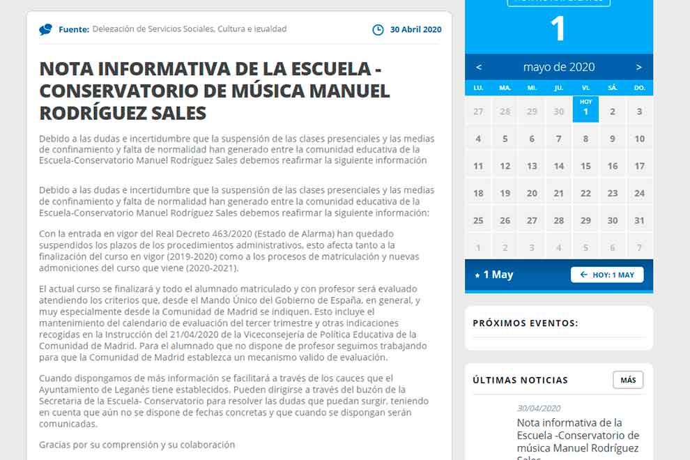 El Ayuntamiento de Leganés ha elegido una desconocida forma de emitir una nota pública relativa a la situación de la Escuela de Música. La nota en cuestión, apareció en una de las webs secundarias del consistorio (lacalledelaculturadeleganes.es). Y dicha nota era para depositar en la Comunidad de Madrid toda la responsabilidad en cuanto al cierre del curso en la Escuela de Música-Conservatorio, Manuel Rodríguez Sales.