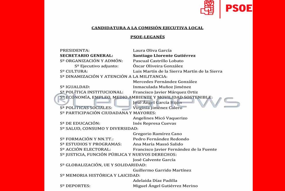Los afiliados del Partido Socialista de Leganés elegirán mañana jueves a la nueva dirección política del partido en nuestra ciudad. No habrá elecciones al presentarse una lista única consensuada entre las diferentes familias de los socialistas locales, pero en la que el peso específico de la misma lo tendrán las personas del actual secretario general y alcalde, Santiago Llorente.