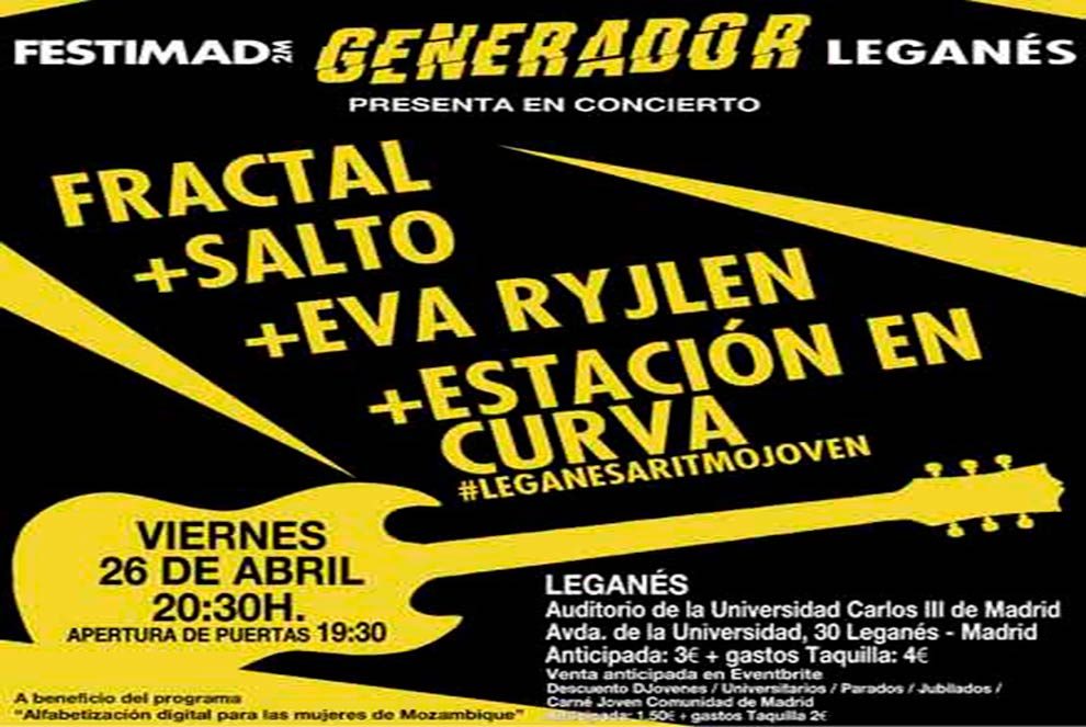 La octava edición de Generador, ya un clásico dentro de Festimad, acogerá este año a cuatro grupos: Eva Ryjlen, ex Idealipsticks, con un talentoso proyecto en solitario, Salto, gigantesco compositor heredero de grandes nombres del Pop y la Americana music. Fractal, rock al que algunos medios especializados han comparado con Bunbury, Héroes del Silencio o Supersubmarina, y Estación en Curva, grupo local de pop fresco, seleccionado para Festimad entre los tres ganadores del concurso Leganés a Ritmo Joven, organizado por el programa DeJóvenes del Ayuntamiento de Leganés para dar visibilidad y protagonismo a los jóvenes músicos de la ciudad.
