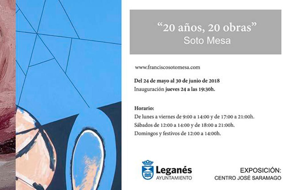 Francisco Soto Mesa presenta en la sala de exposiciones José Saramago de Leganés su primera exposición antológica “20 obras, 20 años”, donde se puede ver una selección de veinte obras creadas en los últimos 20 años, una obra por cada uno de ellos. Para el artista: “Esta idea de pequeña retrospectiva será estimulante porque me facilitará reflexionar sobre el trabajo de estas dos últimas décadas y sugerente en general porque se podrán valorar los cambios conceptuales, de método y procedimiento que se han producido en mis obras en estos últimos veinte años”.