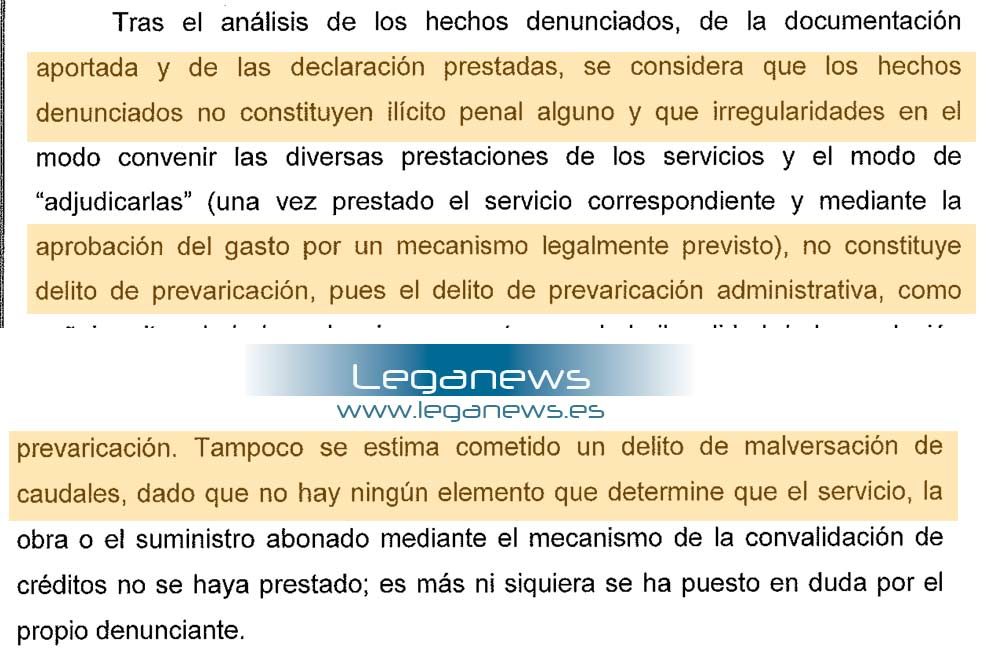 Añade además que “tampoco se estima cometido un delito de malversación de caudales, dado que no hay ningún elemento que determine que el servicio, la obra o el suministro abonado mediante el mecanismo de convalidación de créditos no se haya prestado”.