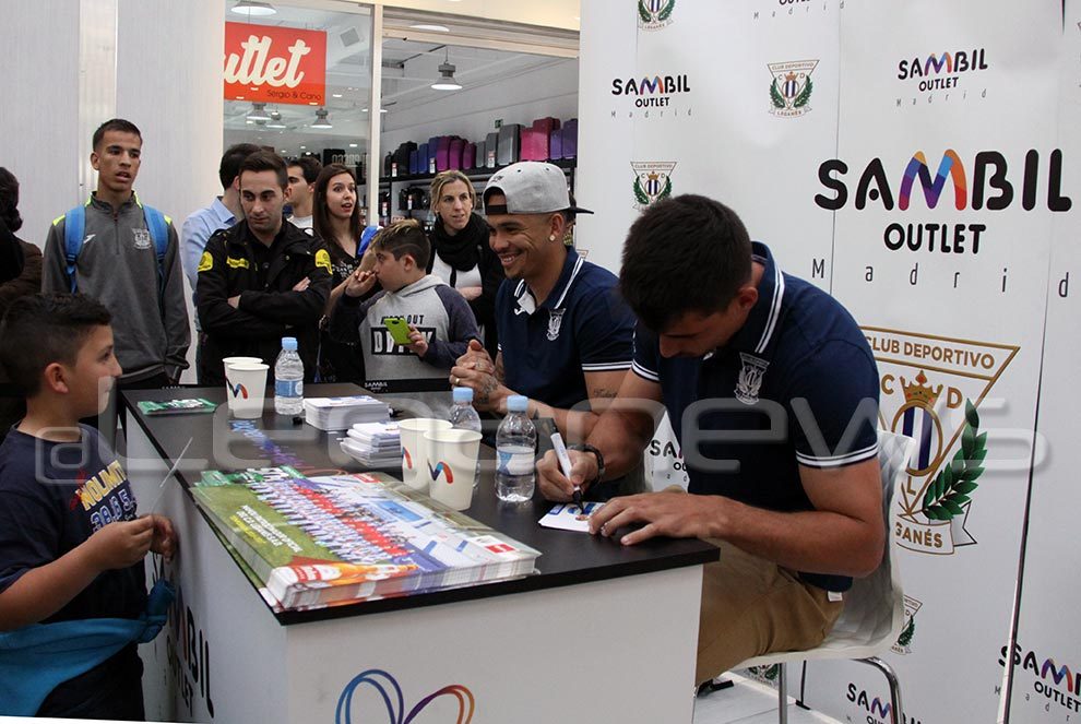 Los jugadores del Club Deportivo Leganés Gabriel Pires y Luciano han firmado esta tarde todo tipo de objetos del club a los fans (aproximadamente unos 200) del equipo pepinero en el Centro Sambil Outlet Madrid, donde el club instaló hace menos de un mes su primera tienda oficial fuera del Estadio Municipal Butarque.