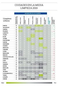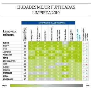Oviedo, Bilbao y Vigo ocupan los tres primeros puestos del raking de ciudades más limpias de España con puntuaciones de 79, 77 y 76, respectivamente; todas ellas sobre un total de 100 posibles. Leganés ocupa el puesto 42 del ranking con una puntuación de 45. La encuesta no concede ni siquiera el aprobado a nuestra localidad. Las tres ciudades más sucias de España son Jaén, Alicante y Alcalá de Henares, con 31,34 y 36 puntos, respectivamente.