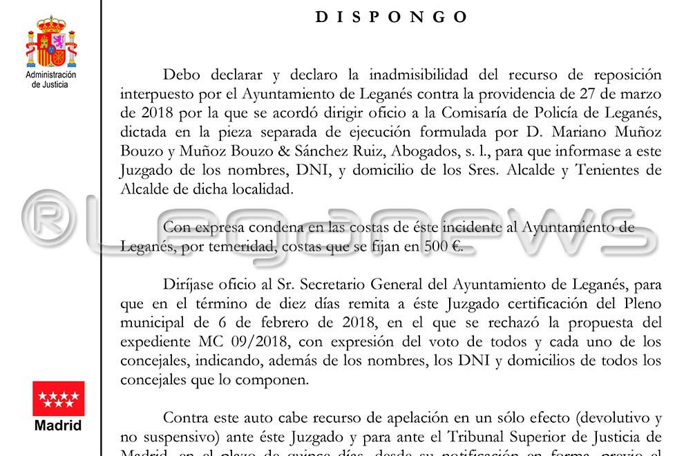 El Juzgado de lo Contencioso-Administrativo número 3 de Madrid ha requerido al Secretario General del Ayuntamiento de Leganés un auto, con fecha 20 de abril (el viernes de la semana pasada) en el que requiere la certificación del Pleno Municipal del 6 de febrero de este año y los nombres, DNI y domicilios de todos 17:26:02los concejales que lo componen.