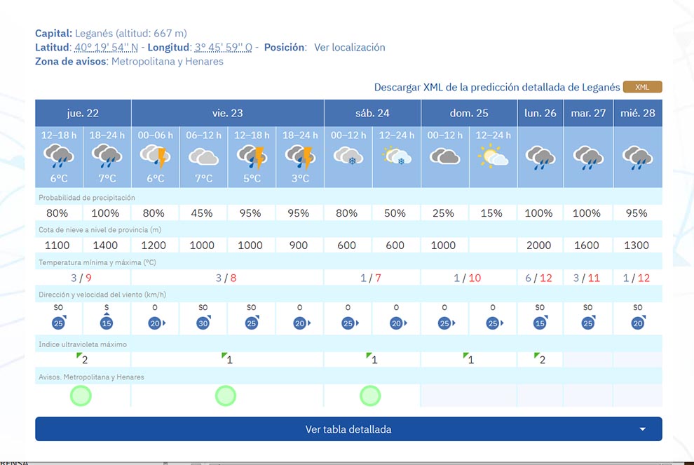 La Agencia Estatal de Meteorología ha actualizado su previsión para los próximos días en lo referente a Leganés con frío, lluvias, viento, tormentas y probabilidad de nieve. Todo ello sin establecer ninguna alerta especial, al menos a la hora de elaborar esta información.