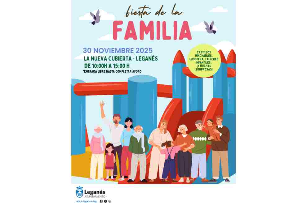 28/11/2025.- El Ayuntamiento de Leganés ha organizado por segundo año consecutivo la Fiesta de la Familia, que se celebrará este domingo 30 en la Nueva Cubierta, de 10:00 a 15:00 horas. Una iniciativa promovida por la Concejalía de Servicios Sociales y Familia y la Junta Municipal de Distrito de San Nicasio que busca reunir a las familias con castillos y toboganes hinchables, ludoteca, circuito de karts a pedales, zona de juegos retro, talleres, espectáculos y sorpresas para todas las edades.
