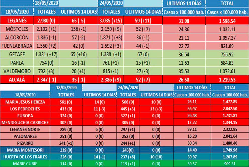 En lo que se refiere al cómputo de casos de los últimos 14 días, nuestra ciudad ofrece un dato negativo (seis casos menos) que el día que comenzará la semana.  La cifra de nuevos positivos es más alta que en Fuenlabrada (+42), Alcorcón (+35), Valdemoro (+22) o Parla (+7).