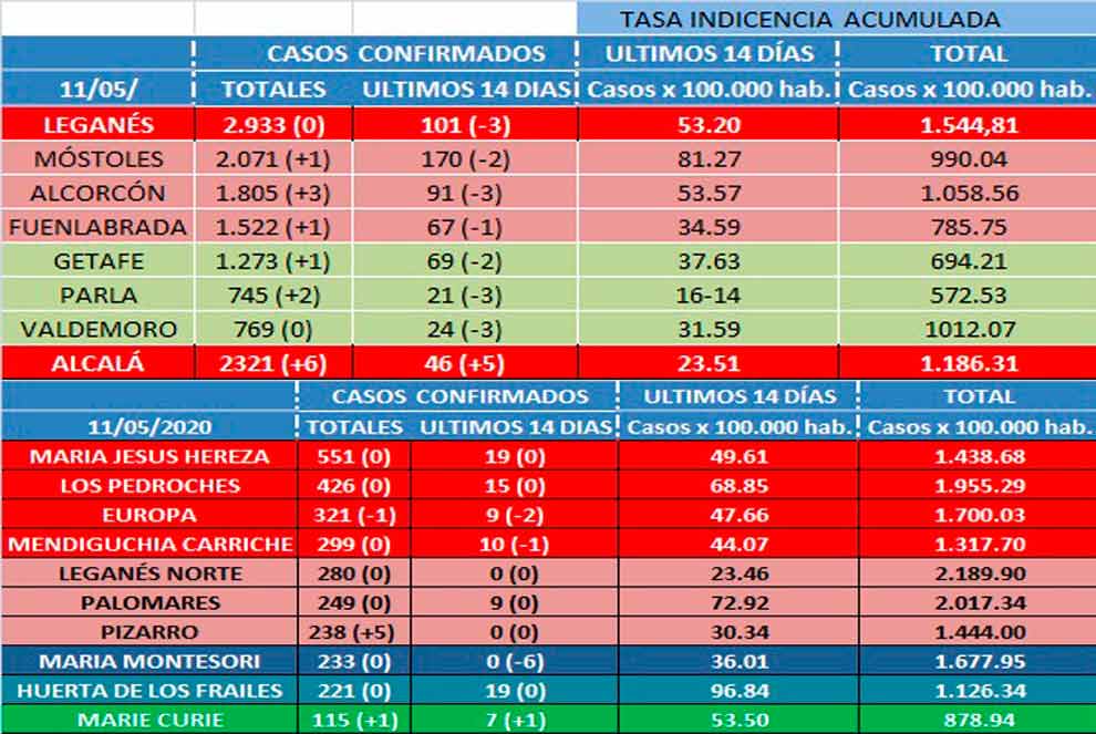 Leganés Norte ofrece contagios cero tomando como referencia las últimas dos semanas desde el 01 de mayo, pero ha crecido en 11 casos durante ese mismo tiempo