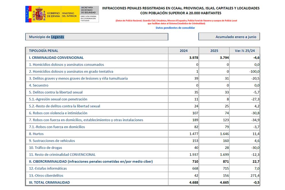 Leganés rebaja el número de delitos convencionales durante el primer semestre de 2025 en relación al primer semestre de 2024. La cifra de un -4,6% significa una rebaja en la criminalidad convencional de 3.978 delitos a 3.794. Por otro lado, la cibercriminalidad se incrementa en un 22,7% lo que hace que el dato total suponga una rebaja porcentual de un -0,5%. Estos datos se elaboran de acuerdo a los datos aportados al Sistema Estadístico de Criminalidad por Policía Nacional, Guardia Civil y Policía Local.