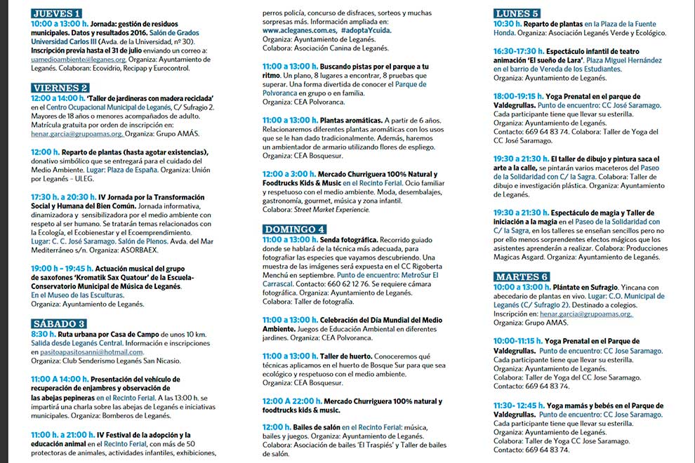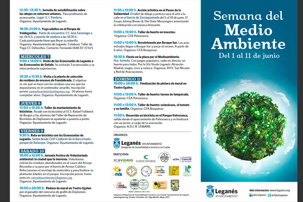 El Ayuntamiento de Leganés ha organizado junto a numerosas entidades de la ciudad la tradicional Semana del Medio Ambiente que durante once días programará actividades de ocio y educación ambiental en la localidad. Con estas jornadas, el Ayuntamiento quiere invitar a los vecinos y vecinas a sumarse al cuidado y respeto hacia el planeta con numerosas actividades y talleres de concienciación y trabajo con niños, jóvenes y adultos.
