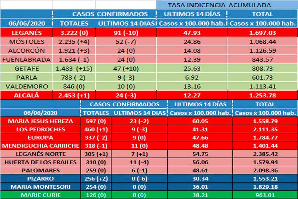 Leganés reporta hoy, por primera vez desde el 18 de mayo, cero test positivos por coronavirus. Tras 18 días sumando nuevos positivos, hasta un total de 243 en esos 18 días, la cifra ofrecida por el Servicio de Virología de la Comunidad de Madrid es cero.