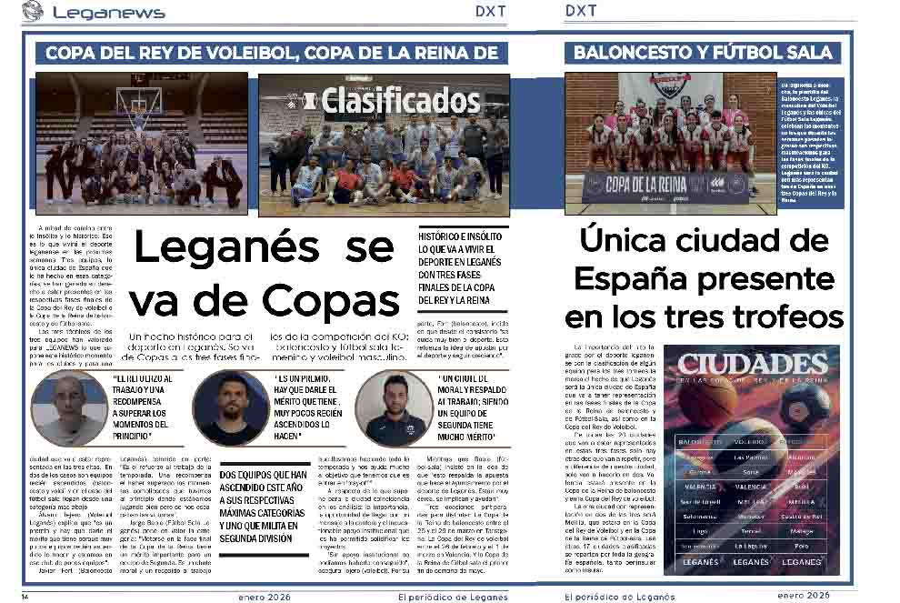 La importancia del hito logrado por el deporte leganense con la clasificación de algún equipo para los tres torneos la marca el hecho de que Leganés será la única ciudad de España que va a tener representación en las fases finales de la Copa de la Reina de baloncesto y de Fútbol-Sala, así como en la Copa del Rey de Voleibol.