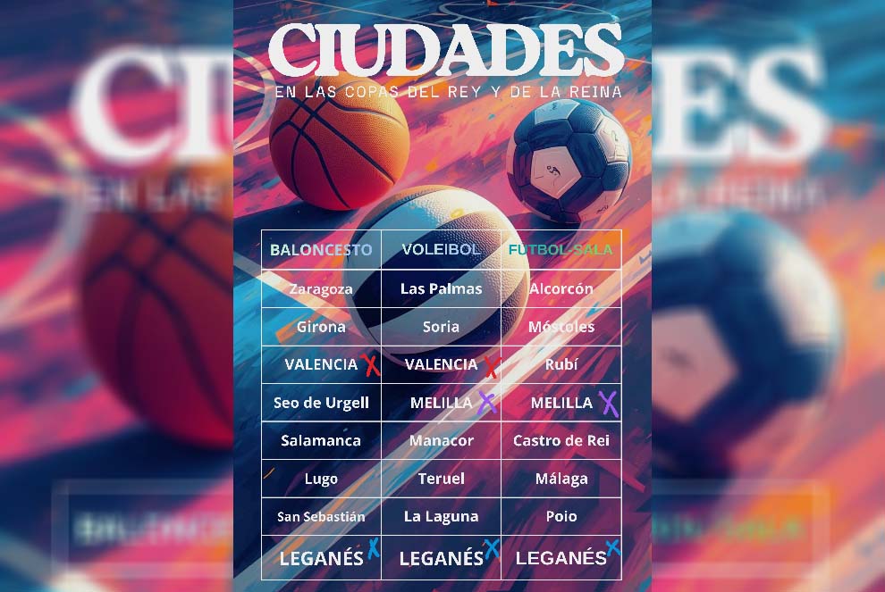 La otra ciudad con representación en dos de las tres será Melilla, que estará en la Copa del Rey de Voleibol y en la Copa de la Reina de Fútbol-sala. Las otras 17 ciudades clasificadas se reparten por toda la geografía española, tanto peninsular como insular.