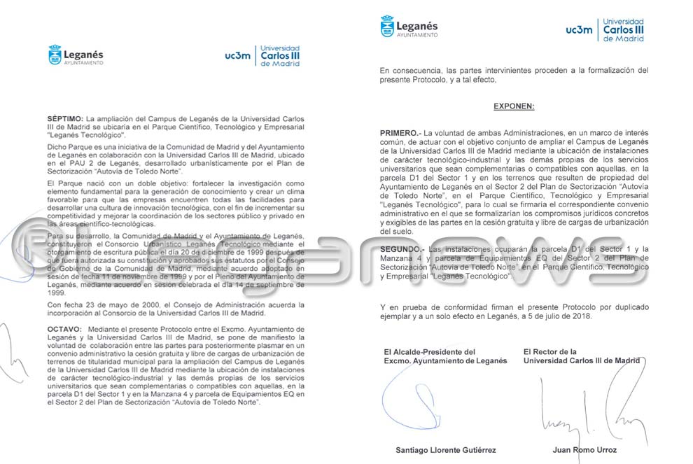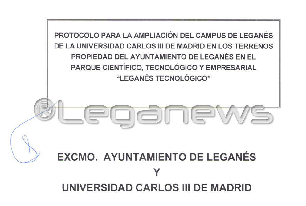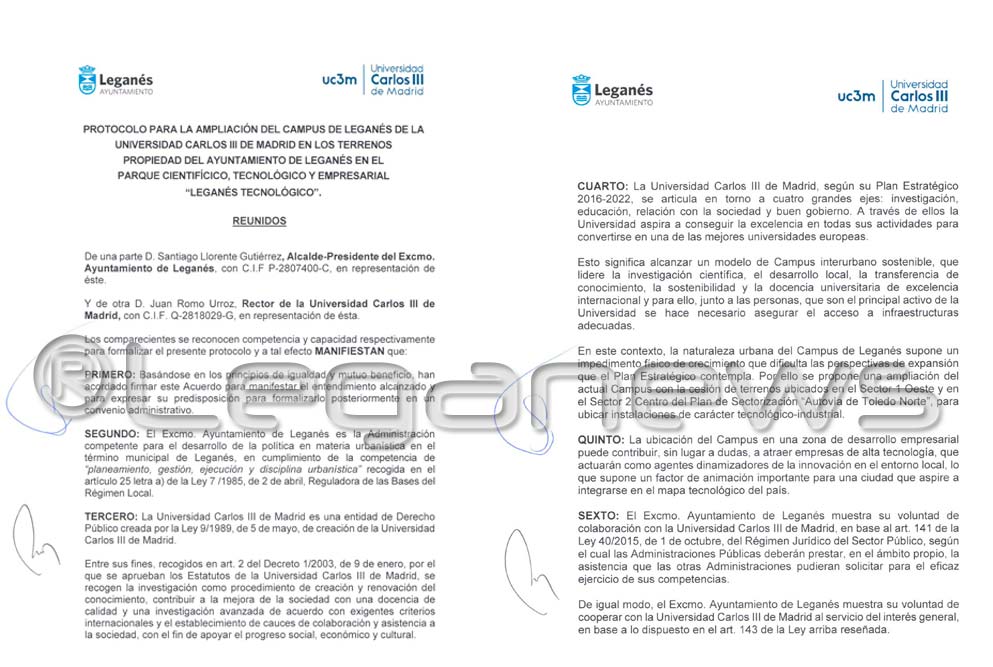 LEGANEWS ha tenido acceso al protocolo de intenciones firmado entre el Ayuntamiento de Leganés y el rector de la Universidad Carlos III de Madrid. Dicho documento, que consta de cinco folios, aparece bajo el titular “Protocolo para la ampliación del Campus de Leganés de la Universidad Carlos III de Madrid en los terrenos propiedad del Ayuntamiento de Leganés en el parque Científico, Tecnológico y Empresarial ‘Leganés Tecnológico'”. Dicho documento fue presentado hace unas semanas por ambas instituciones.