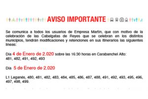 La empresa de autobuses, Empresa Martín, que recorren la ciudad de Leganés han advertido a través de Twitter las modificaciones que sufrirán las líneas de autobuses de la ciudad los días 4 y 5 de enero debido a la llegada de los Reyes Magos y las Cabalgatas.