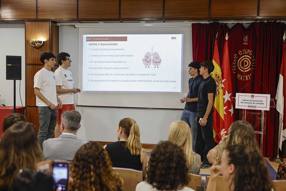 La Comunidad de Madrid ha formado a 81.000 jóvenes de Educación Secundaria Obligatoria (ESO) y Formación Profesional (FP) con sus talleres de prevención y concienciación sobre los peligros de los porros y todos los derivados del cannabis. La consejera de Familia, Juventud y Asuntos Sociales, Ana Dávila, ha asistido hoy a la presentación de una de estas sesiones en el Colegio Obispo Perelló, en el distrito de Ciudad Lineal, dirigida a familias con el objetivo de reforzar el papel de los padres como agentes clave en la prevención de conductas de riesgo.