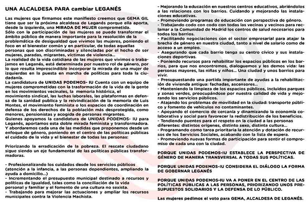 “El manifiesto de apoyo a Gema Gil en su camino a la alcaldía de Leganés relata, bajo una mirada ‘feminista y transformadora’, todas las medidas necesarias para hacer de este importante municipio del sur de nuestra región, un referente en materia de igualdad y justicia social”.