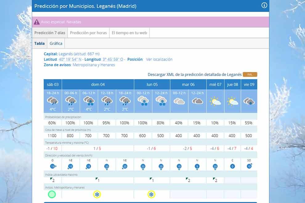 Según la AEMT, la probabilidad de que caígan precipitaciones en nuestra ciudad en forma de nieve entre las doce de la noche del domingo y las doce del mediodía del lunes es de un 100%. Anteriormente a esa hora se esperan lluvias que, con el paso de las horas, podrían convertirse en nieve según la citada organización.