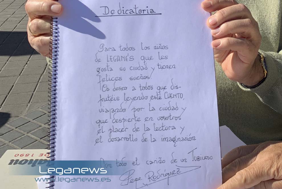 “Para todos los niños de Leganés que les gusta su ciudad y tienen felices sueños. Os deseo a todos que disfrutéis de este cuento viajando por la ciudad y que despierte en vosotros el placer de la lectura y el desarrollo de la imaginación. Con todo el cariño de un jubilado. Pepe Rodríguez”.