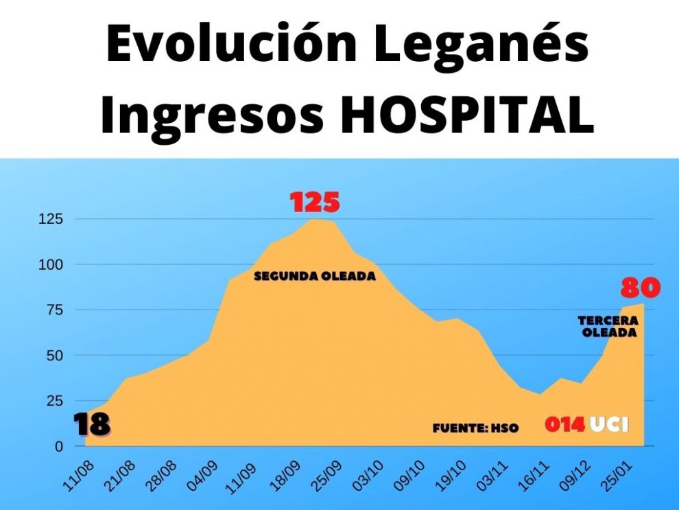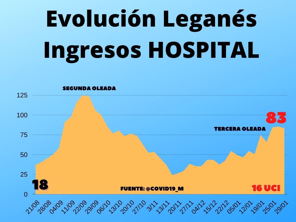 El Hospital Severo Ochoa de Leganés parece estabilizar el número de pacientes ingresados por COVID en la tercera ola de la enfermedad. Según los datos aportados por la cuenta de twitter en la que comparten datos médicos de todos los hospitales de Madrid eran algo más de 80 los ingresados el pasado viernes (foto inferior). Del mismo modo, según fuentes del propio hospital, la cifra de ingresos lleva oscilando durante los últimos días entre 70 y 80.