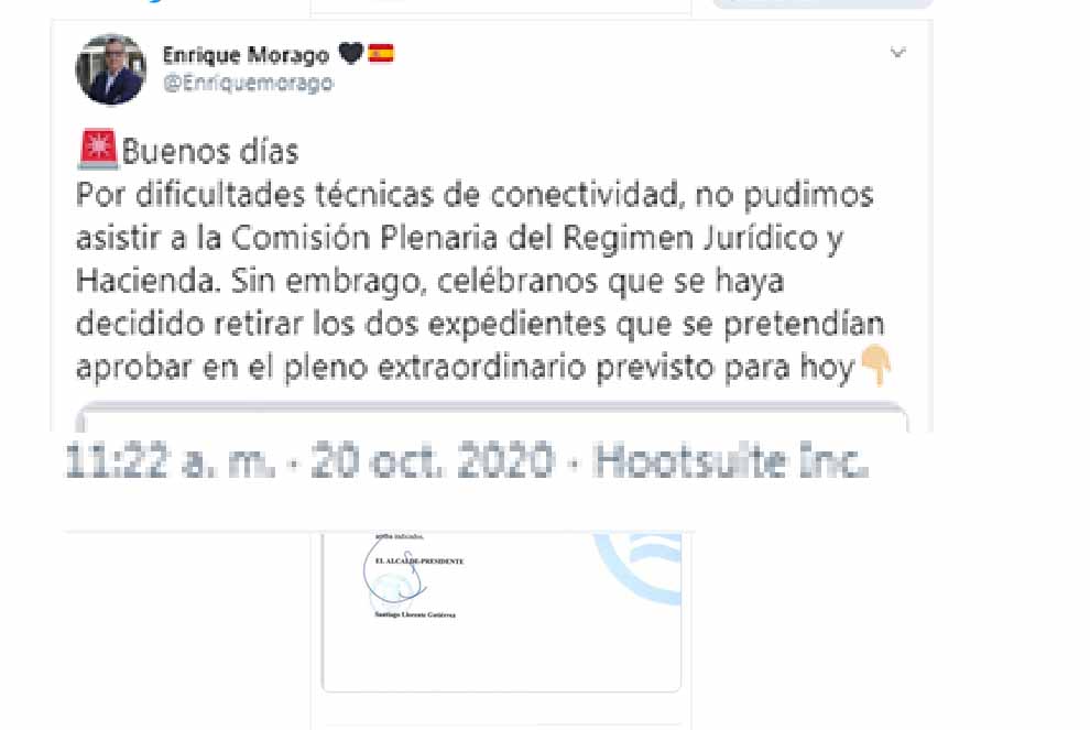 El portavoz de Ciudadanos, usando una aplicación informática para programar tuits, ha explicado dos horas y 20 minutos después de la suspensión y de su no asistencia que no estuvo presente por “dificultades técnicas de conectividad”. Pese a su ausencia ha celebrado la retirada de ambos expedientes. Si todo lo que ha dicho en el tuit fuese cierto, el gobierno local se queda sin ‘muleta’.