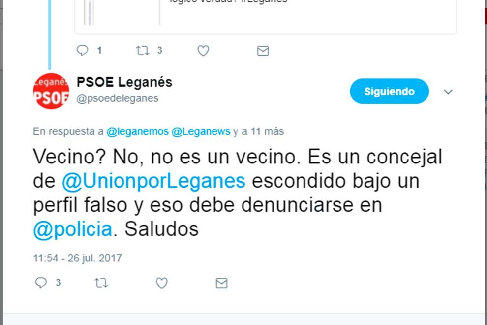 En mitad de esta conversación, desde la cuenta de Leganemos se pregunta si va a haber respuesta a un vecino, a lo que el PSOE responde con cotundencia: “¿Vecino? No, no es un vecino. Es un concejal de Unión por Leganés escondido bajo un perfil falso y eso debe denunciarse en Policía”.