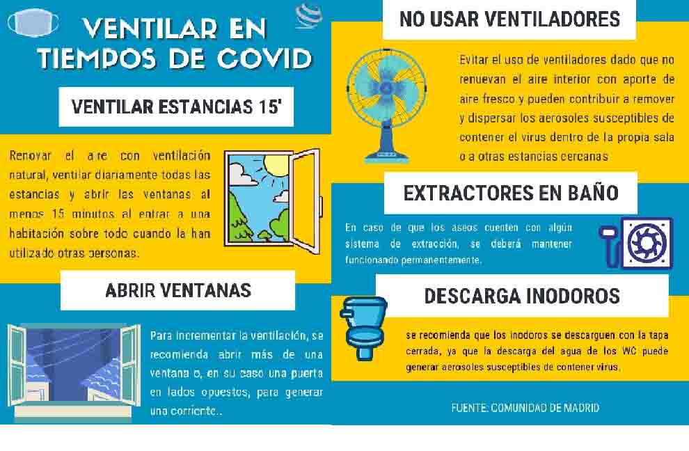 Asimismo, debe evitarse el uso de ventiladores dado que no renuevan el aire interior con aporte de aire fresco y pueden contribuir a remover y dispersar los aerosoles susceptibles de contener el virus dentro de la propia sala o a otras estancias cercanas. No obstante, si es necesario su uso, es importante renovar el aire del espacio, abriendo ventanas y reduciendo lo máximo posible el aire que sopla de unas personas a otras.