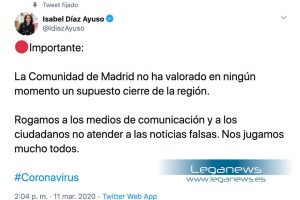La presidenta de la Comunidad de Madrid ha transmitido a través de la red social Twitter que “los medios de comunicación y los ciudadanos no atiendan a...