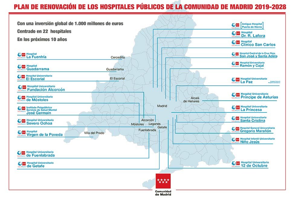 El Plan incluye asimismo una inversión de 250 millones de euros para reformar otros 14 hospitales –Móstoles, Príncipe de Asturias, Severo Ochoa, Getafe, Fuenlabrada, Alcorcón, Virgen de La Poveda, Virgen de la Fuenfría, Guadarrama, El Escorial, Hospital Central de la Cruz Roja, Santa Cristina, José Germain y Rodríguez Lafora- y se incorpora una inversión estimada de 42 millones de euros para la conversión del antiguo Hospital Puerta de Hierro en un nuevo y moderno centro Hospitalario de Cuidados y Recuperación Funcional de Pacientes.