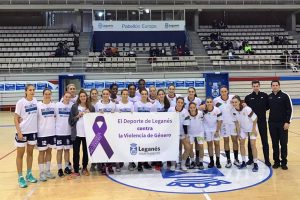 Durante el fin de semana en cinco pabellones de la localidad lució el lema ‘El deporte de Leganés contra la violencia de género’ Los jugadores de los...