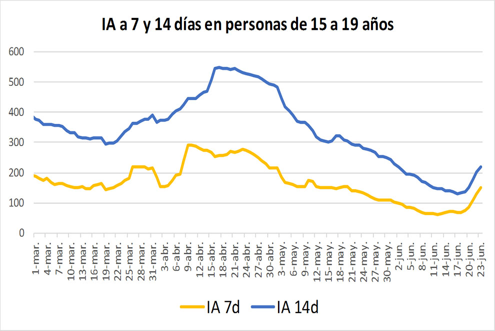 En dichos datos se revela un descenso en dicha IA en todos los tramos de edad: 0-14, 15-44, 45-64, y 65 o más. Sin embargo, en el momento que el segundo tramo se trocea y se observa el tramo de edad entre 15 y 19 se observa un destacado incremento en la IA a 14 días a partir del 17 de junio. Hecho que se repite en fechas en el caso de la IA a siete días también desde el mismo periódo.