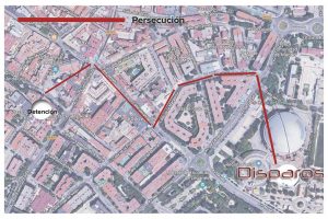 La persecución fue por la calle Margarita, donde hubo seis disparos y se produjo la herida de la persona magrebí, calle Getafe hasta Costanilla de Tovares Tras...