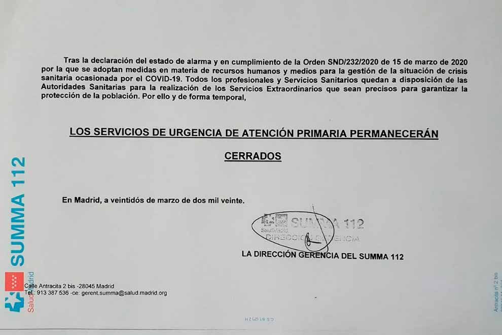 La Dirección Gerencia del Summa 112 ha remitido hace unos minutos un escrito por el que han decidido suspender los servicios de urgencia de atención primaria que “permanecerán cerrados”. La justificación de dicha decisión es la puesta a disposición de todos los servicios extraordinarios para proteger a la población.